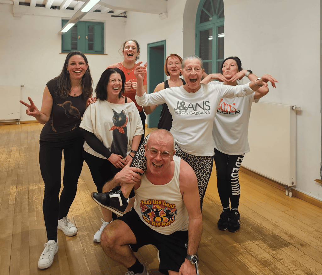 Ik heb twintigers in de les. Ik heb mensen van in de zestig. De muziek is de rode draad, niet de leeftijd. Niemand wordt betutteld, niemand krijgt te horen dat-ie het maar rustig aan moet doen. De reeksen zijn richtlijnen, geen regels — wil je vol gas gaan, prima. Wil je het rustiger aan doen, ook prima. Jouw lichaam, jouw keuze, jouw plezier.